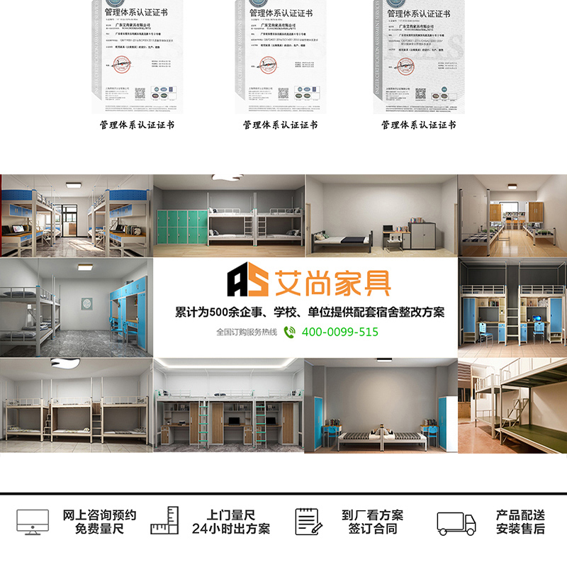 產品介紹: 艾尚家具大學生宿舍床外觀上高端大氣,并且安全舒適。大學生宿舍床采用環保0甲醛烤漆,無論悶熱潮濕都恍然如新。 做工設計上,大學生宿舍床采用卡口式連接,這種連接的優點在于承重性強,穩固性好,上床時非常平穩,不易搖晃,安全舒適,可以適應各種宿舍。